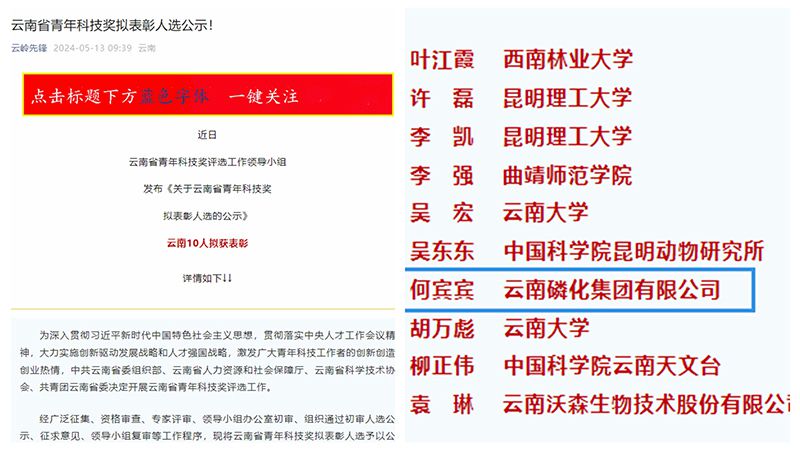 近日,云南省青年科技獎評選工作領(lǐng)導(dǎo)小組發(fā)布了《關(guān)于云南省青年科技獎擬表彰人選的公示》,公司研發(fā)中心磷化工團隊負責(zé)人何賓賓擬獲得“云南省青年科技獎”榮譽。